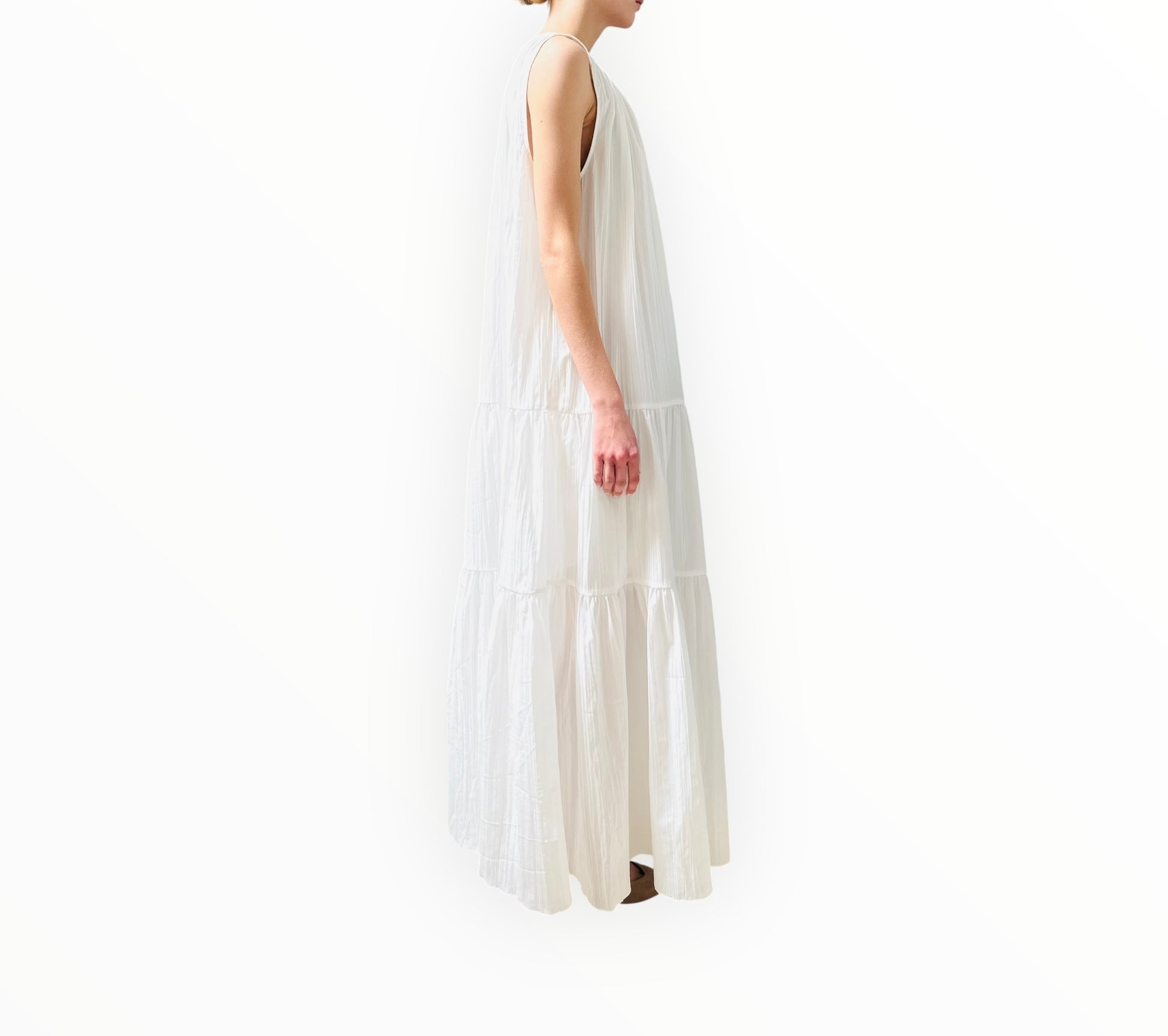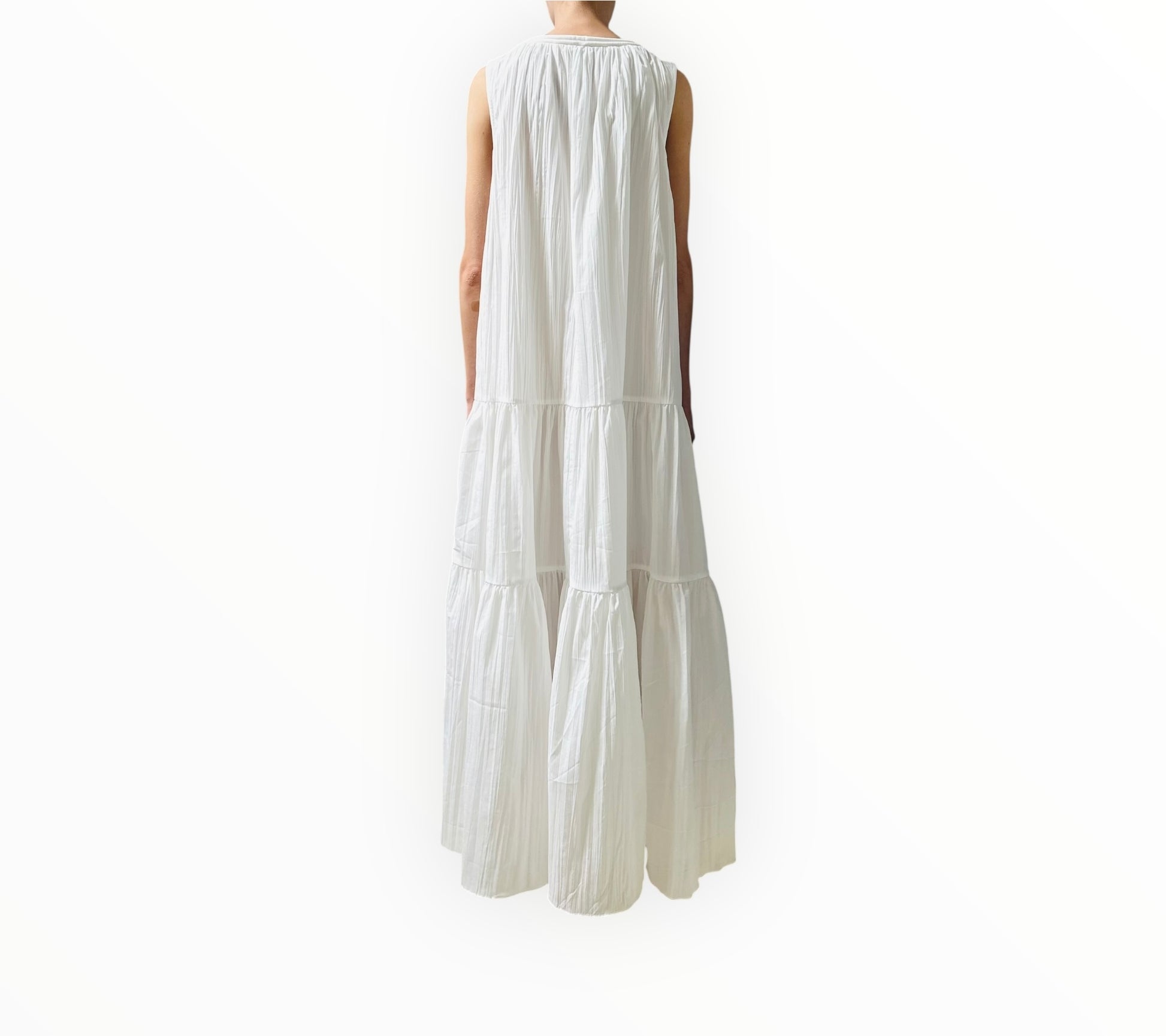 Introducing the Radmoor Maxi Dress in Ivory, a beautifully tiered and gathered maxi dress crafted from crinkle fabric for a relaxed, effortless fit. This flowing design features a deep front neckline accented by gold hardware for a touch of sophistication. Hidden side seam pockets add a practical element, while the unlined construction gives it a lightweight, breezy feel—perfect for casual elegance.