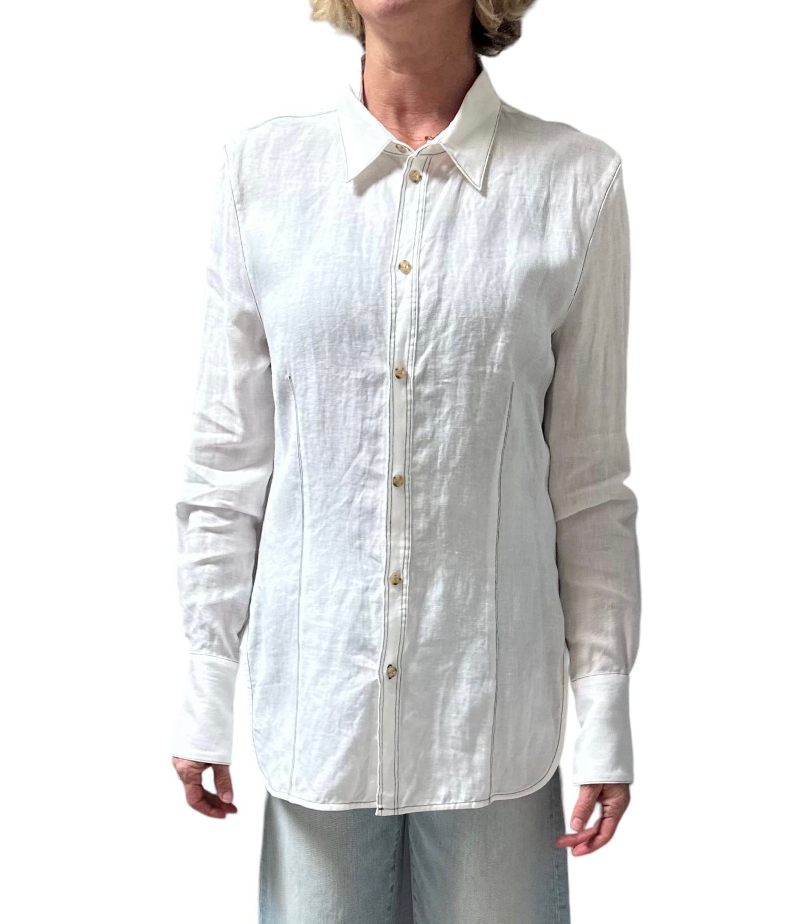 Linen shirt from Bassike featuring contrast stitching detail and 12cm cuffs with one button closure.
