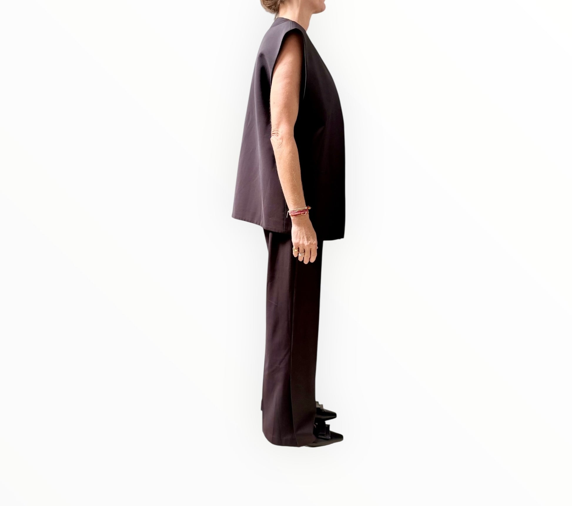 Oversized vest and wide leg split hem pants by Camilla and Marc.