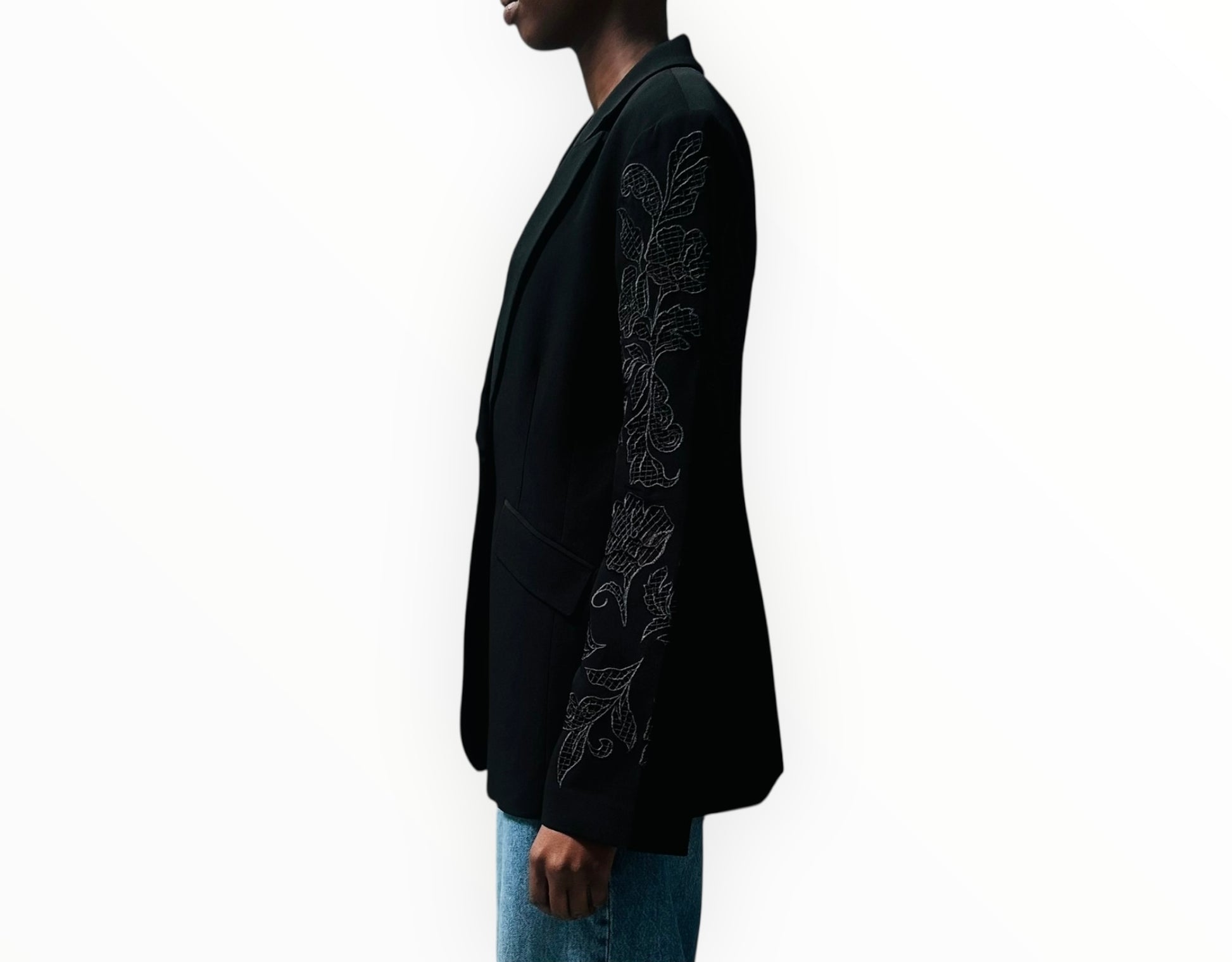 Stunning jacket from Cinq A Sept with cutout embroidered sleeves. Single-breasted, front flat pockets and back vent.