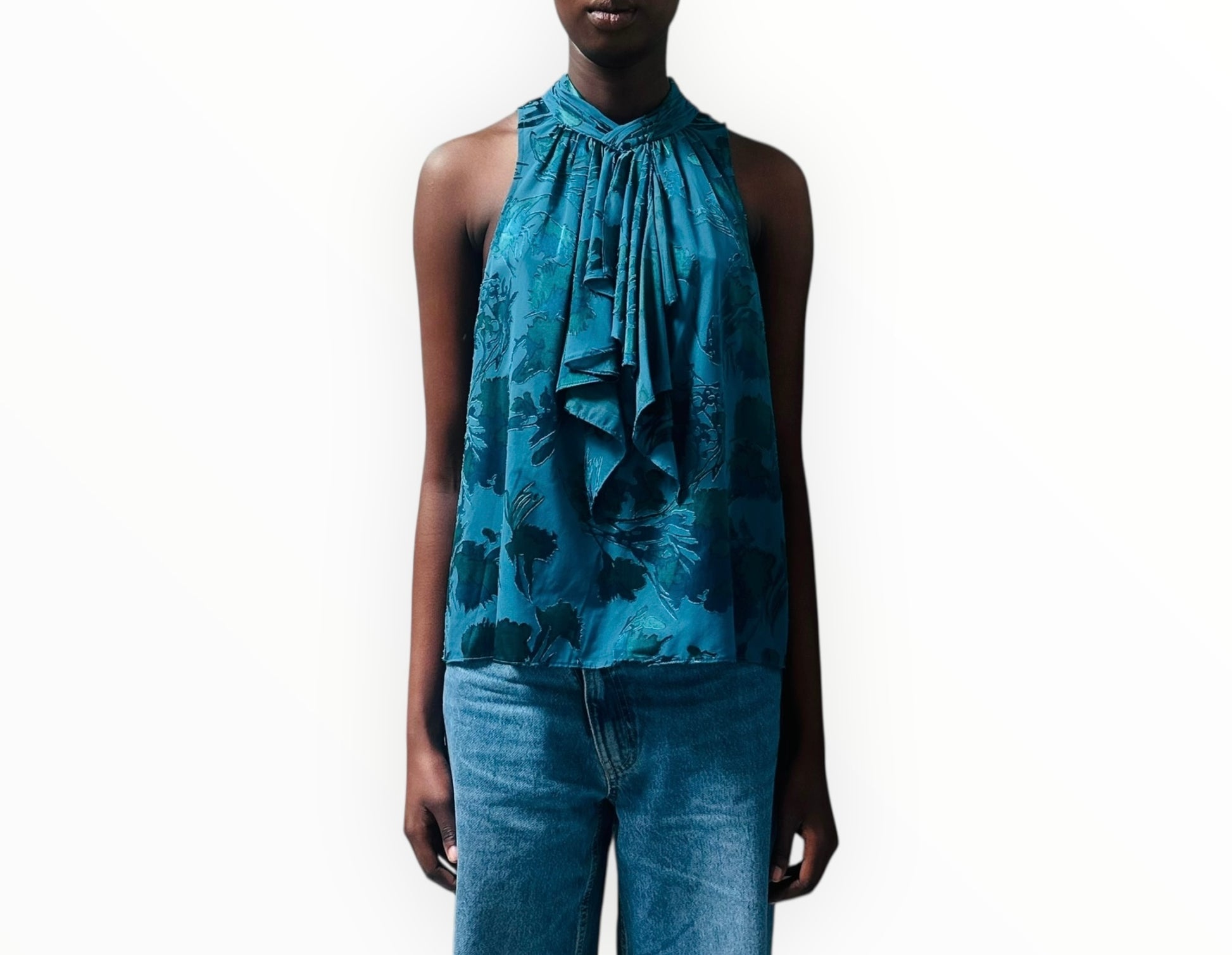 Burnout satin top from Cinq A Sept with tie neck detail.