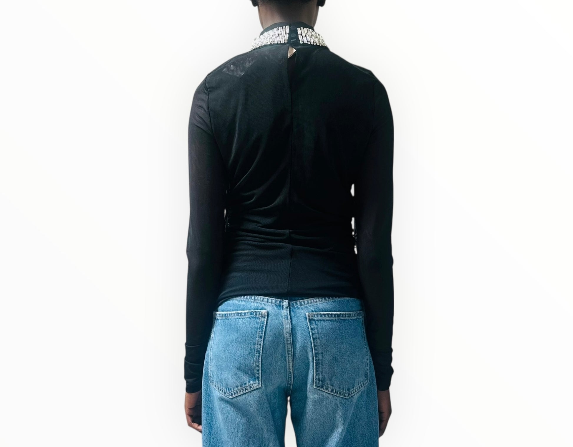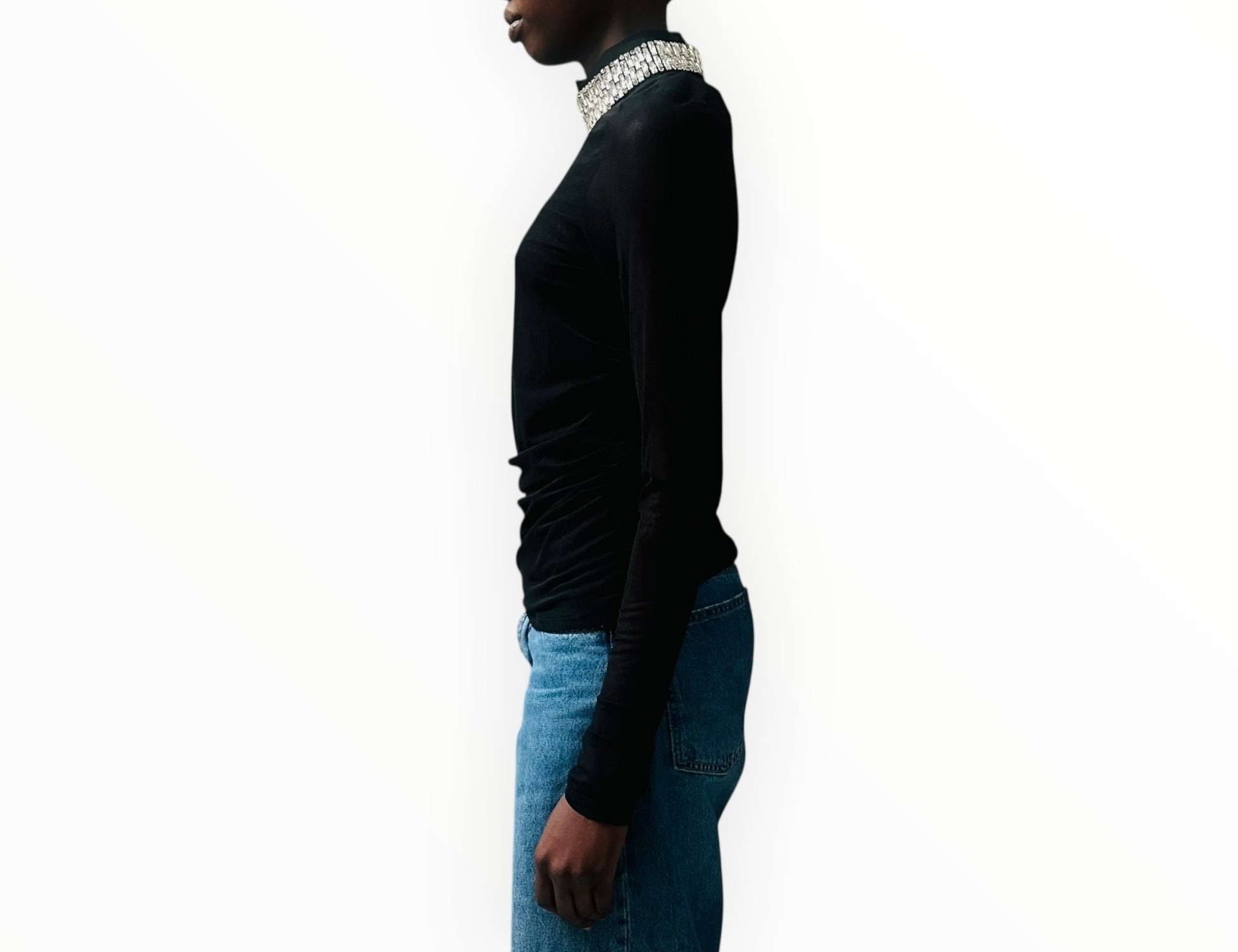 Stunning tulle top with stacked necklace at neck. Ruched sides and sleeves.
