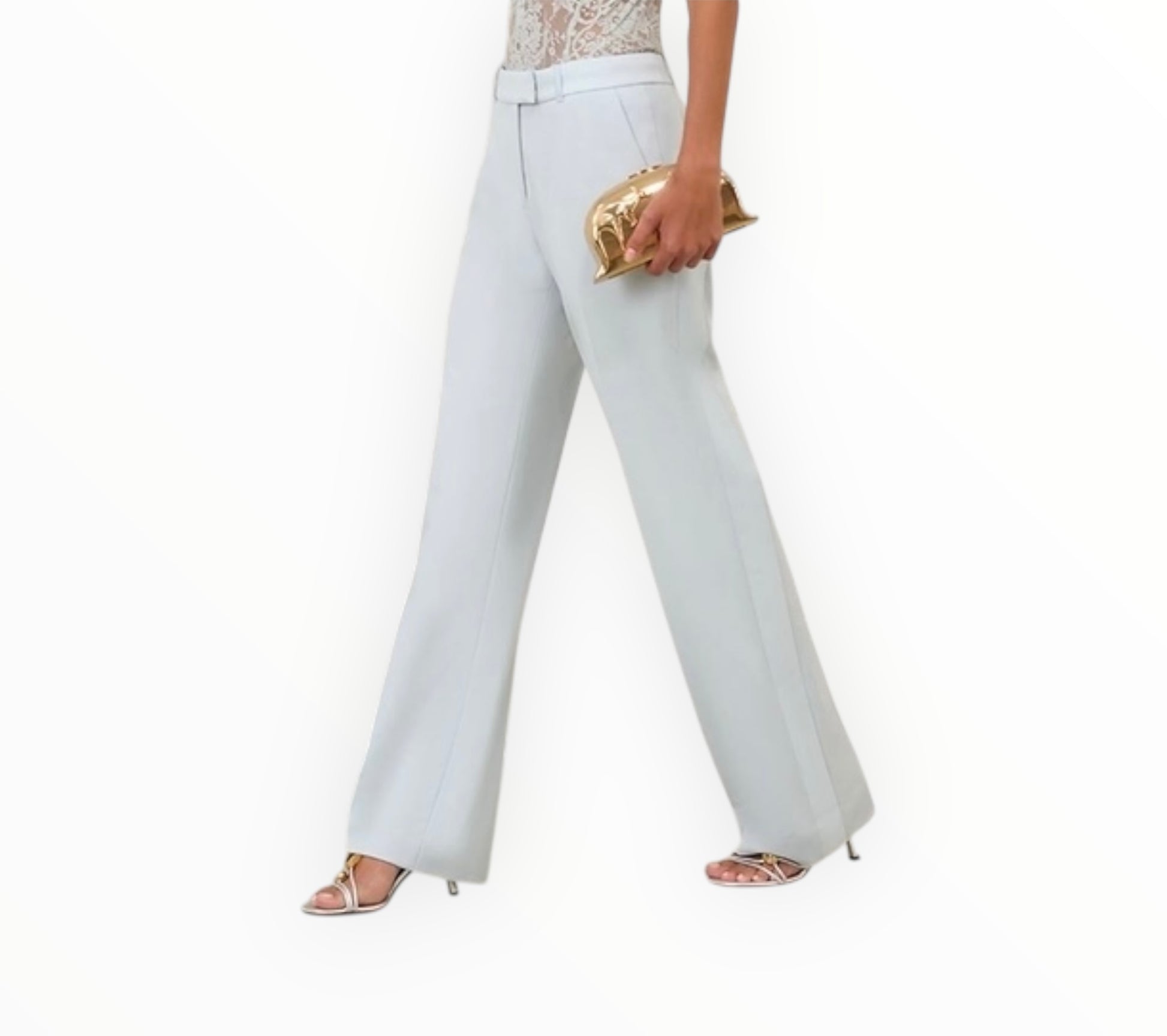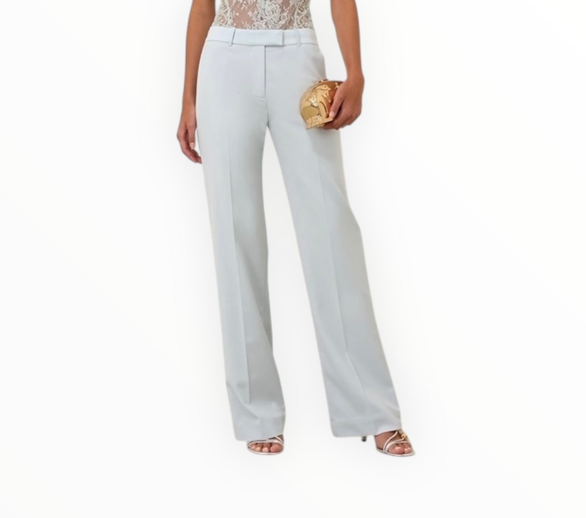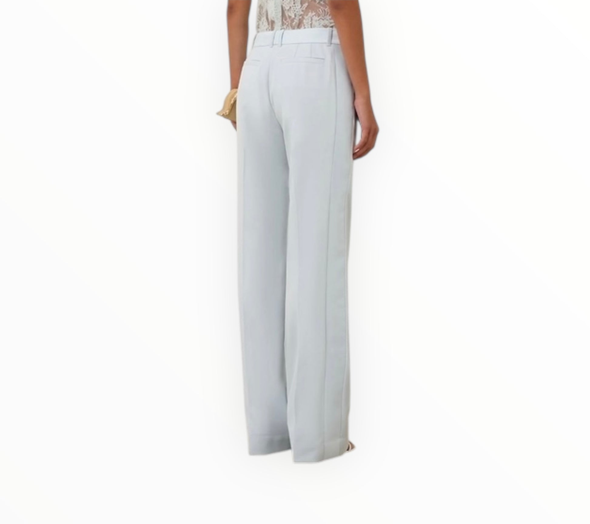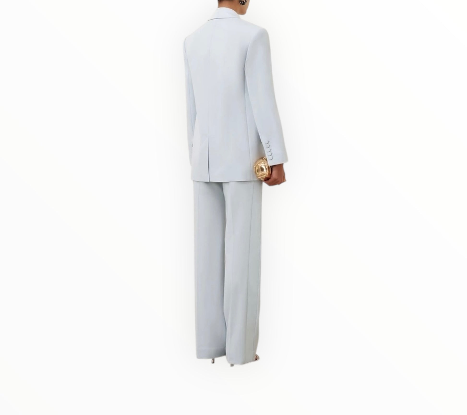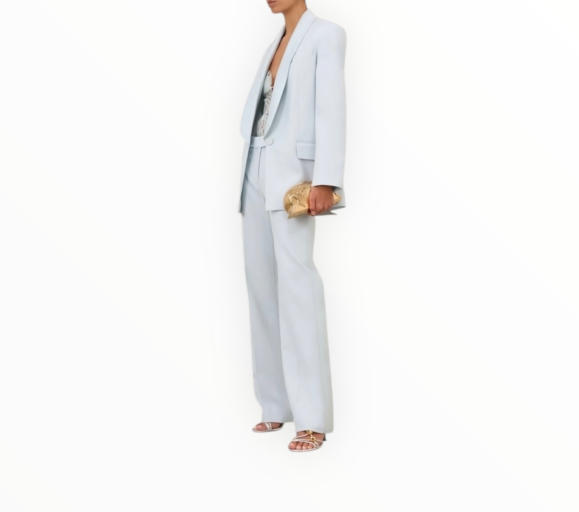 The Illuminate Shawl Tux Jacket in Sea Foam from Zimmermann Spring 2025 Collection, Illumination. A wool blend jacket featuring a shawl collar, front pockets and a button closure at centre front and on the cuffs. Tailored jacket,Single breasted,Left front breast pocket,Button detail on the cuffs,Single vent at centre back. Pants feature a wool blend straight leg, low rise pant featuring a contrast panel on side leg, side seam pockets and a front fly closure.