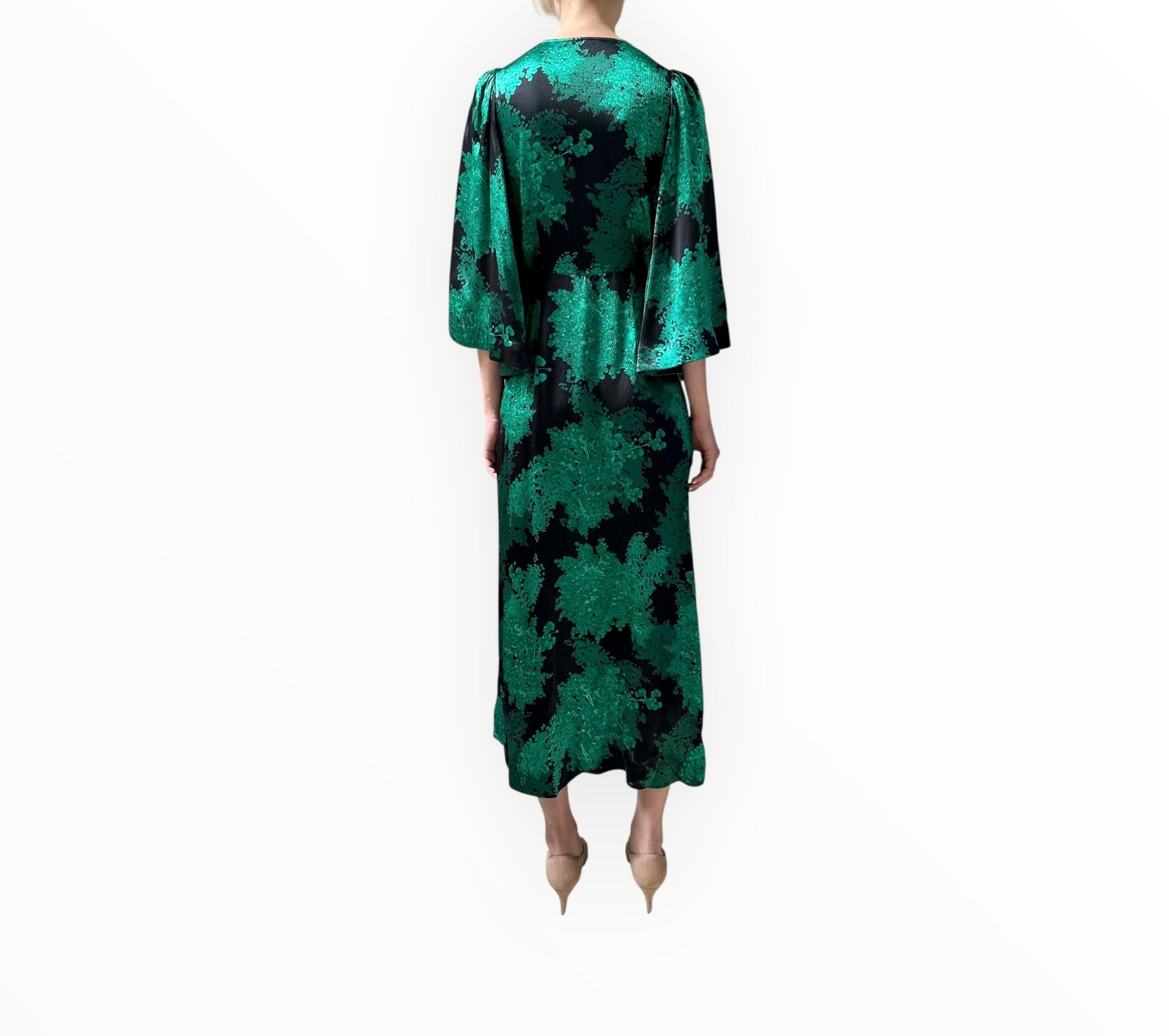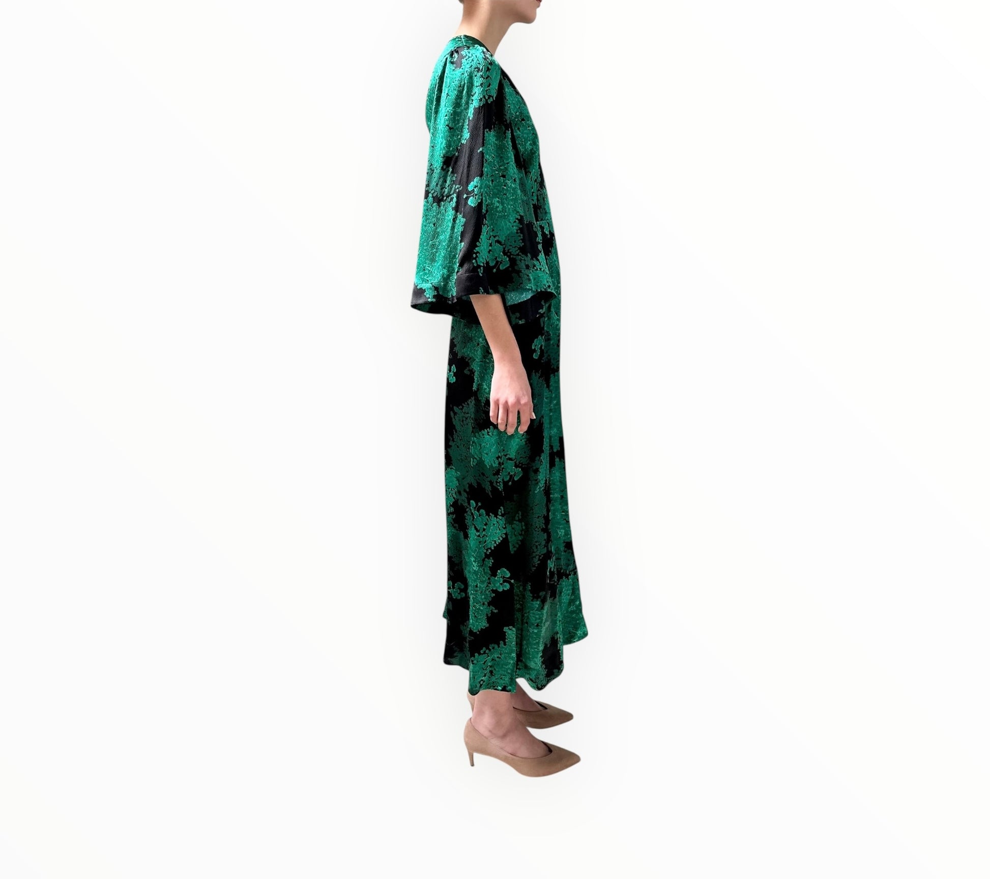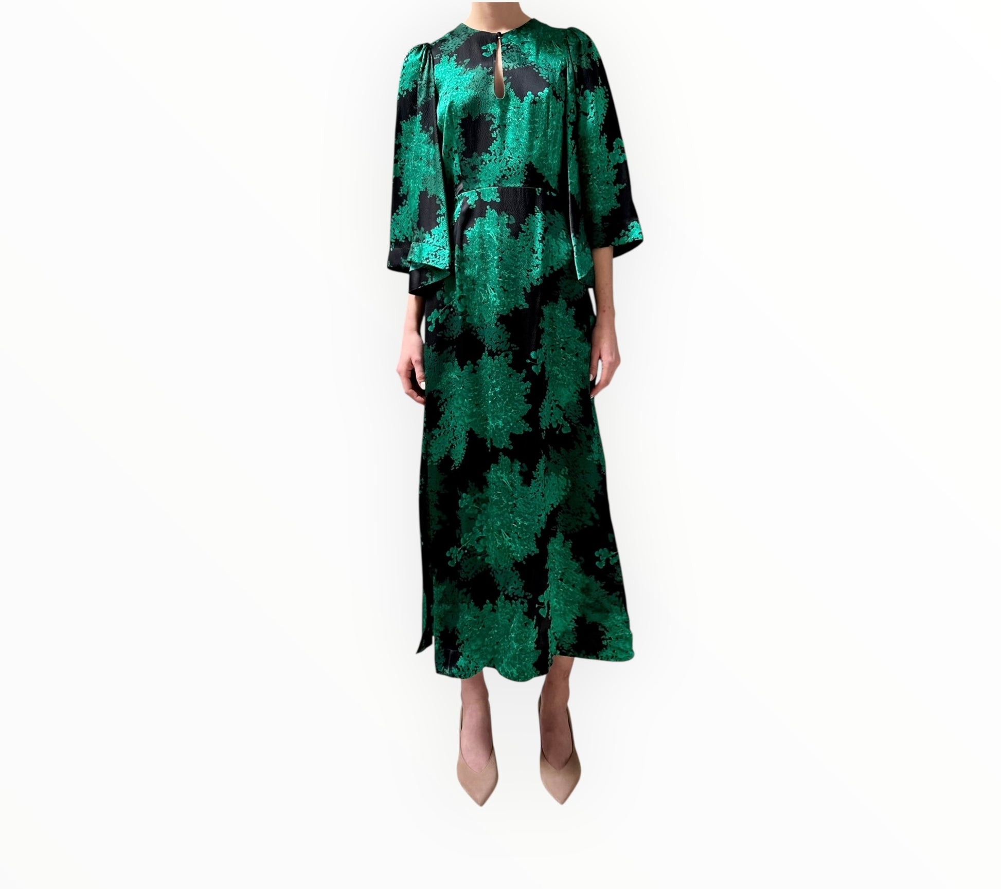 Beautiful silk dress from Husk, featuring high neck with keyhole and button opening. Flared sleeves and self fabric belt.