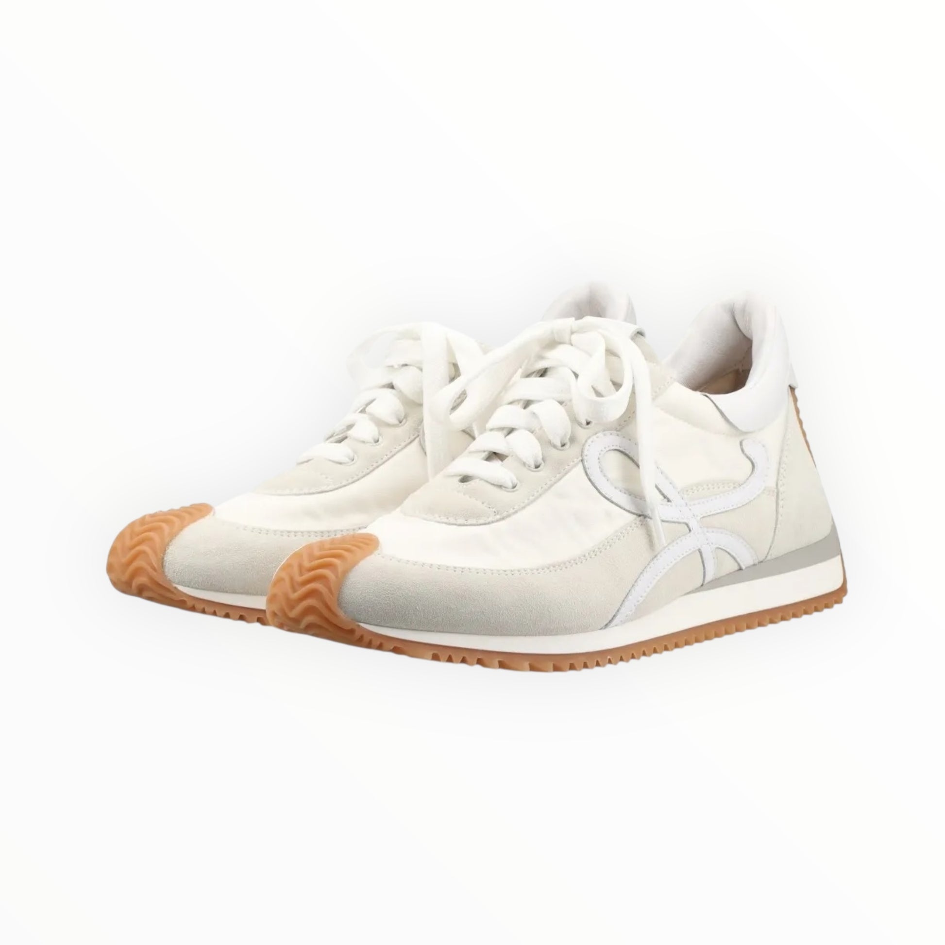 LOEWE is known for its leather craftsmanship, which sets these exceptional Flow Runner sneakers apart from the rest. Made from panels of ivory suede and white technical fabric, they have leather "L" patches at the lateral sides, and grooved rubber soles that curl around the toes and up the backs of the heels.