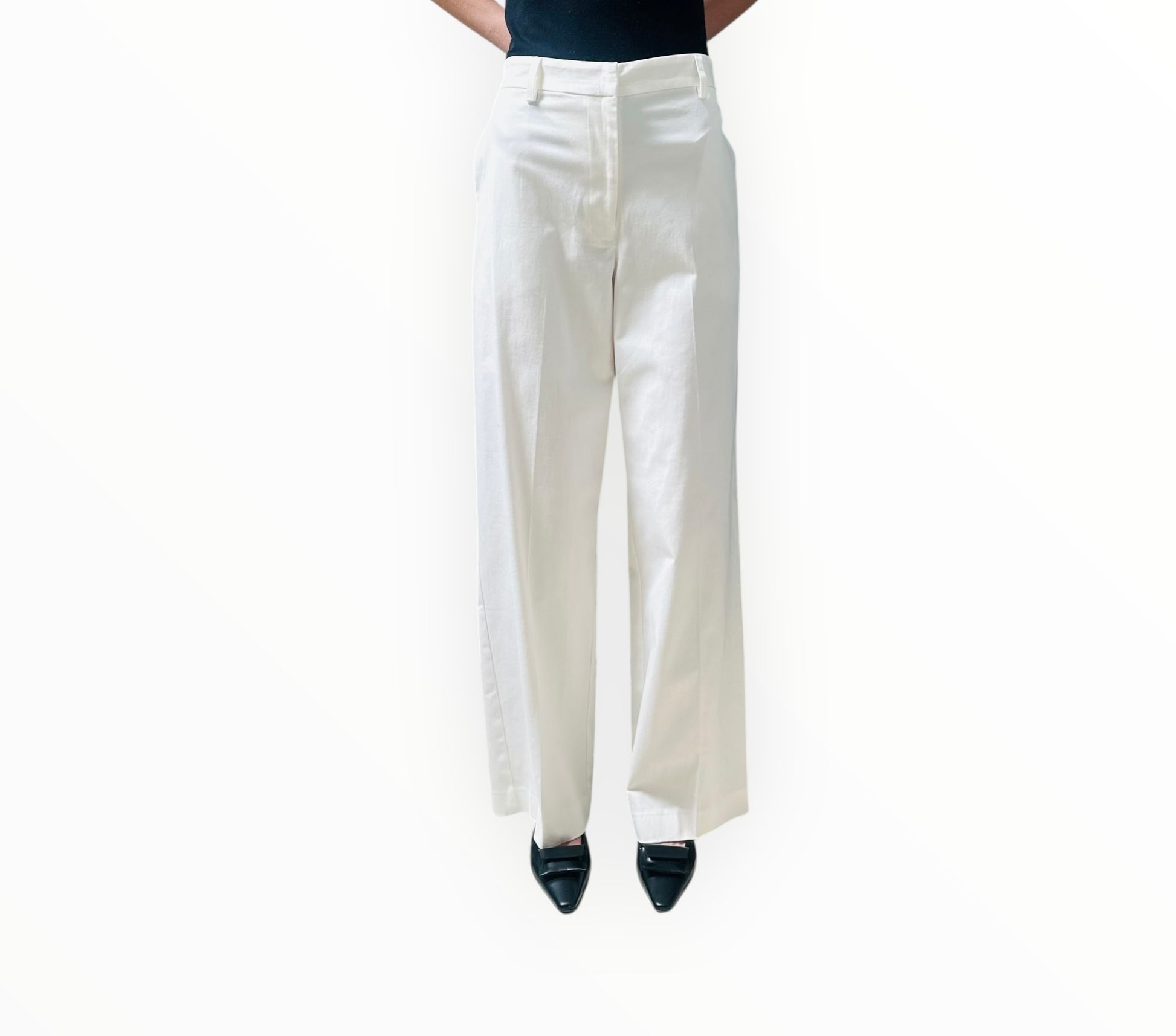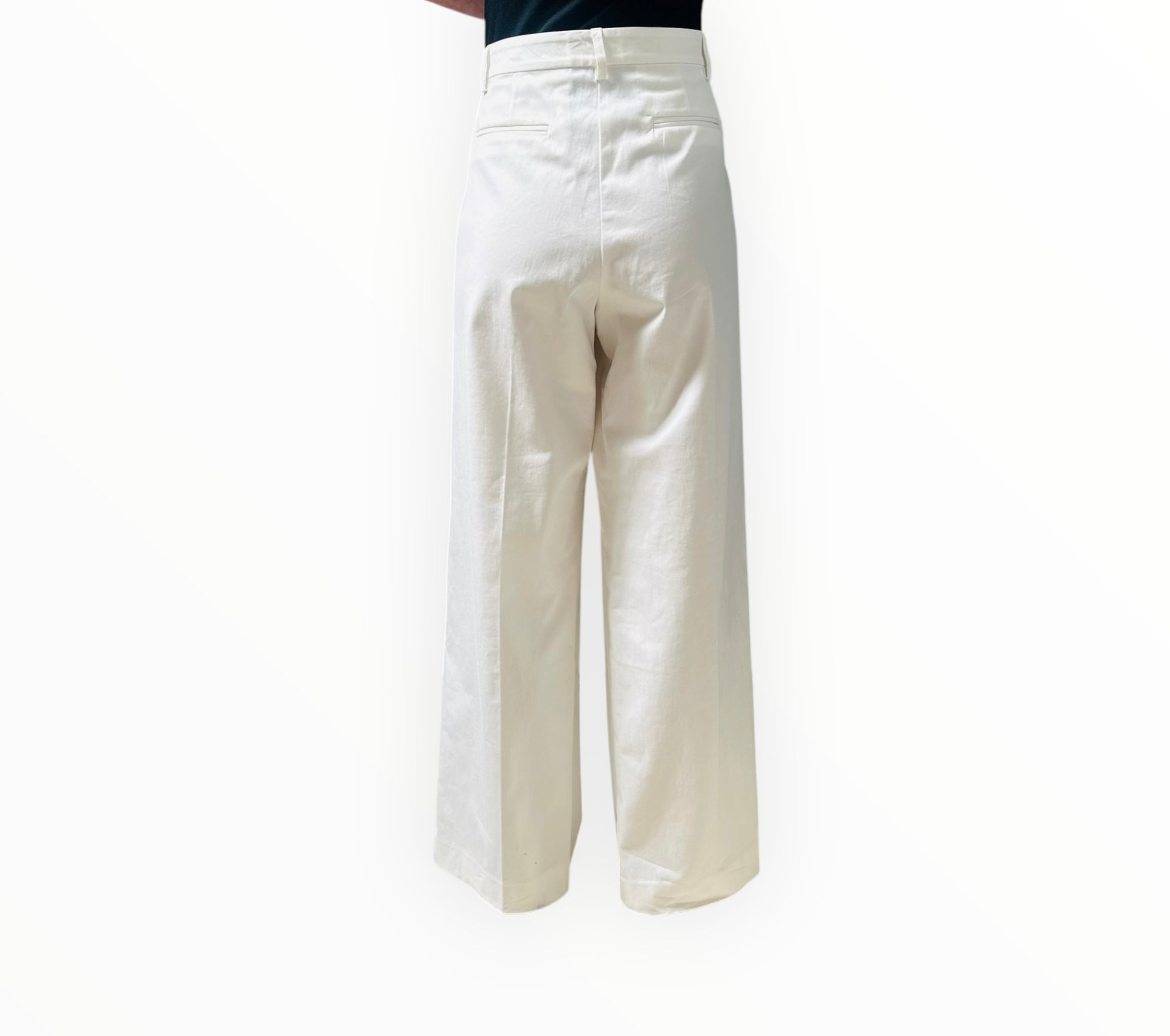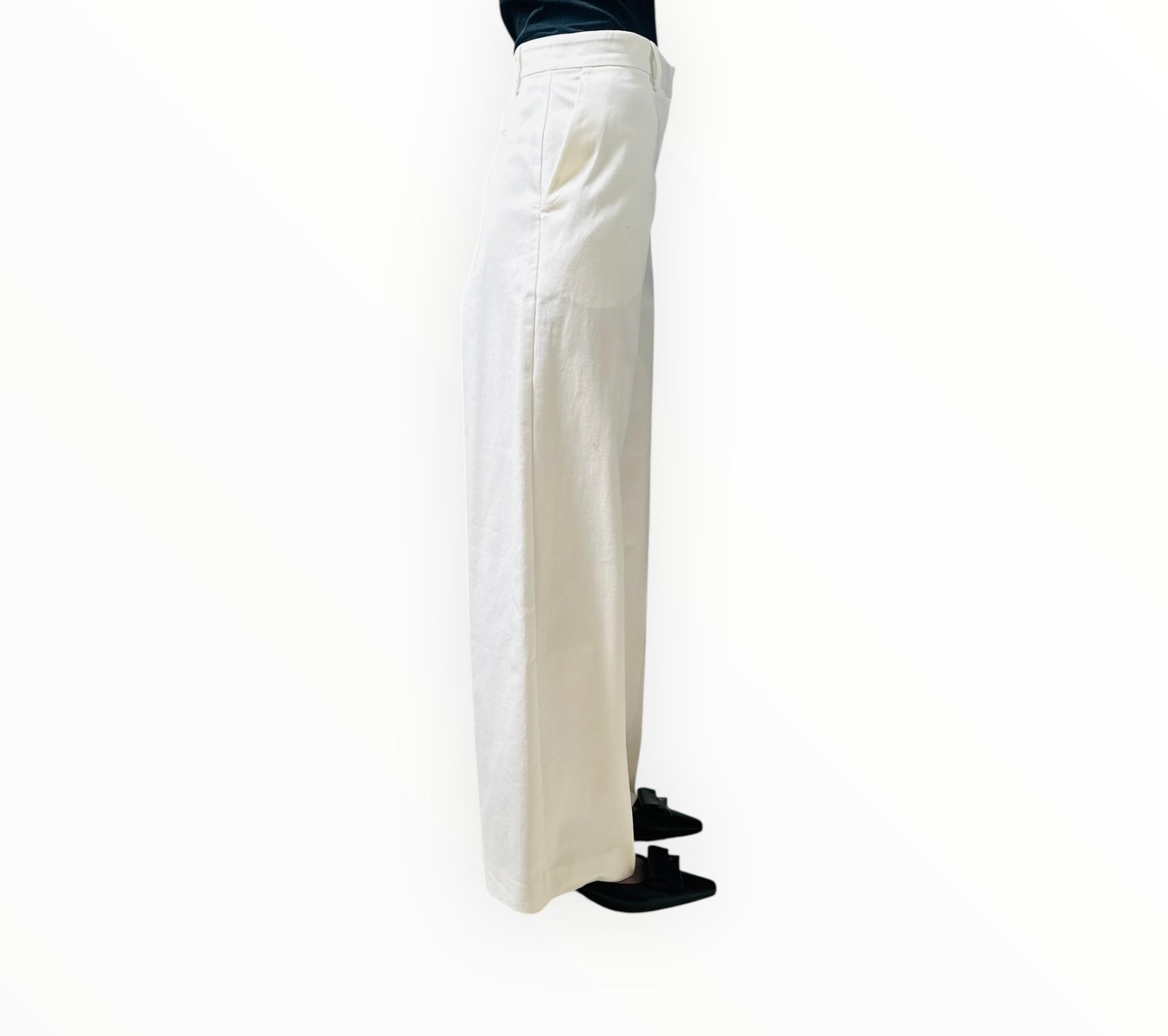 Flat-front pants from Matteau with side pockets with back vent pockets and a wide leg.