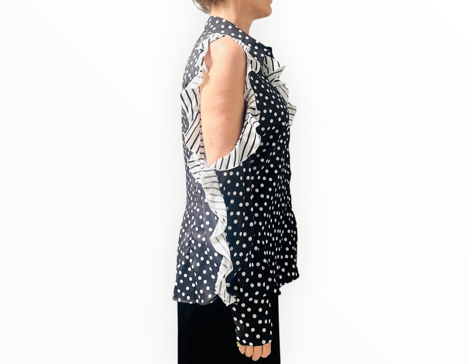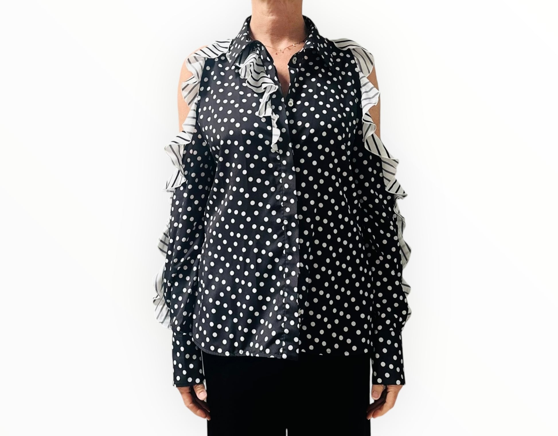 Cute polka dot shirt from MSGM with cut out shoulders and black/white stripe fabric trims.