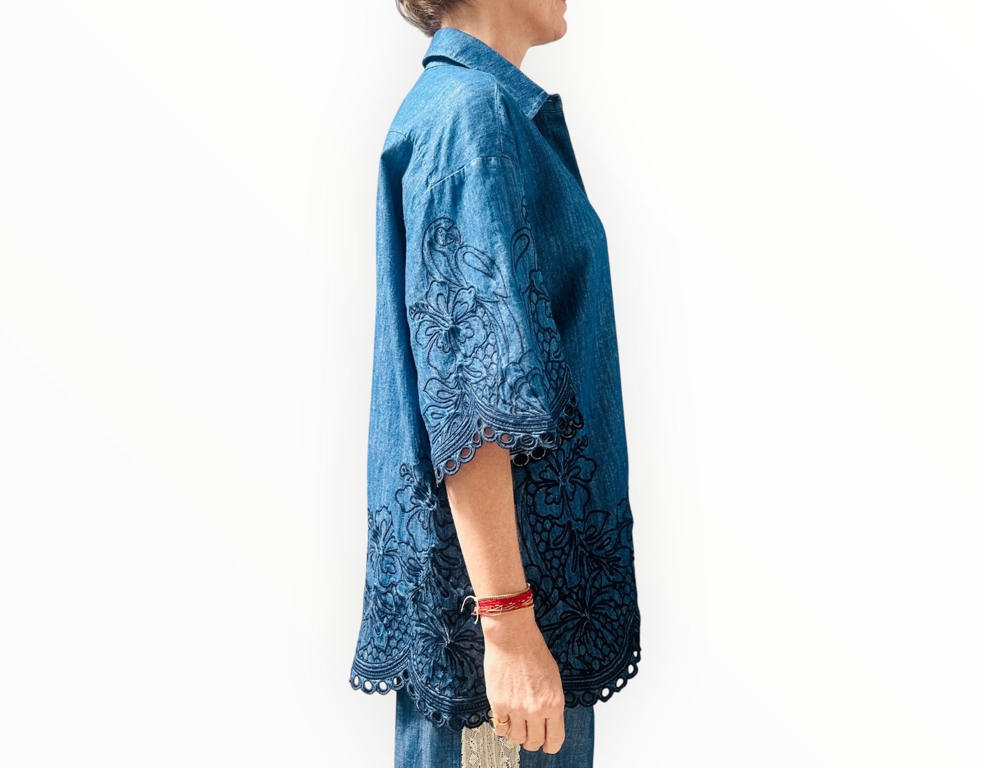 Oversized shirt from Zimmermann, concealed front placket with embroidered sleeves and hem.